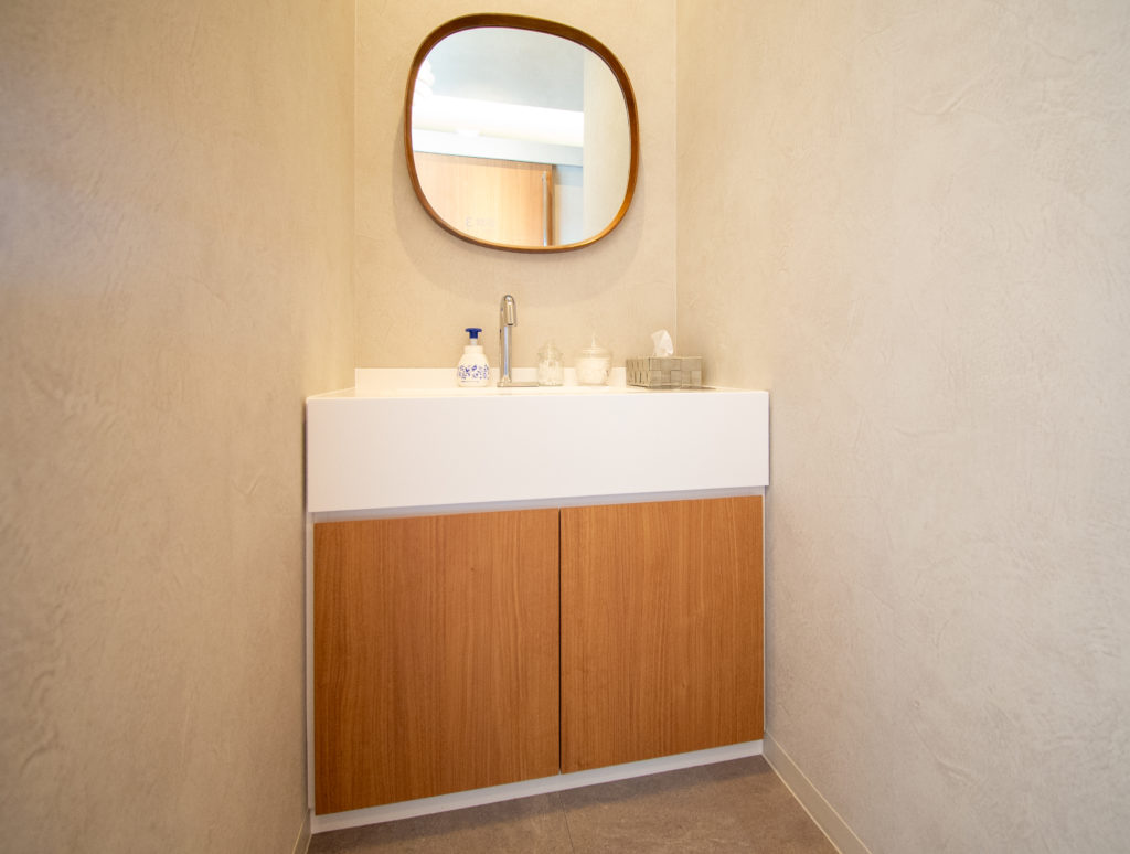診療前後に快適にご利用いただけるよう、清潔で明るいパウダールームをご用意しております。手洗いやお化粧直し、うがいなどにご利用いただけるスペースで、プライバシーにも配慮した落ち着いた空間です。どなたでも安心してご利用いただけるよう、常に清潔な状態を保っております。